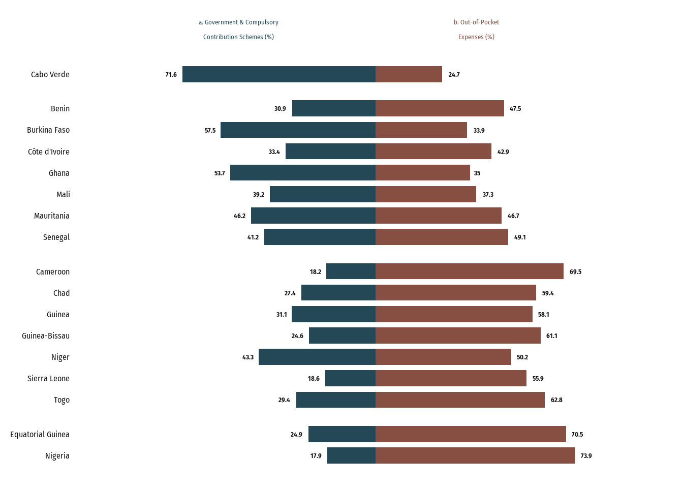 Conduct a comparative analysis of how healthcare is funded in Sub-Saharan West Africa.